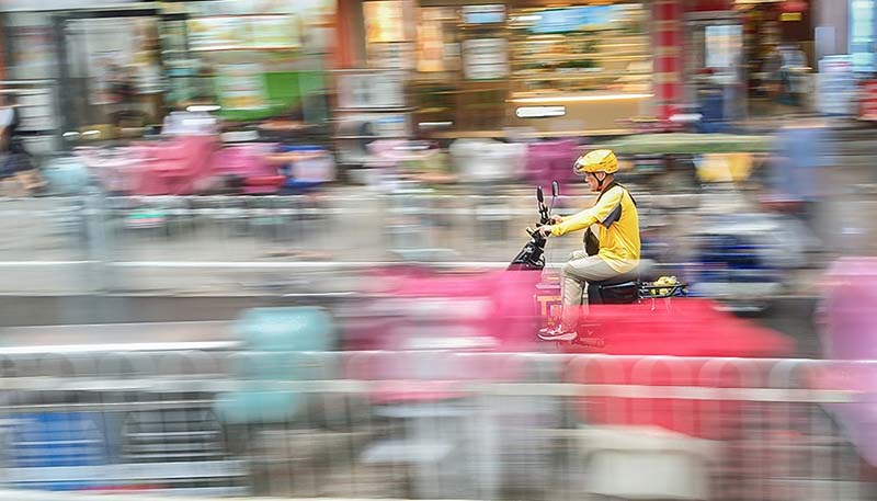 作品簡介:在都市的茫茫喧囂中,辛勞的外賣小哥穿梭其中。該作品采用追隨法手機拍攝于徐州市淮海路。