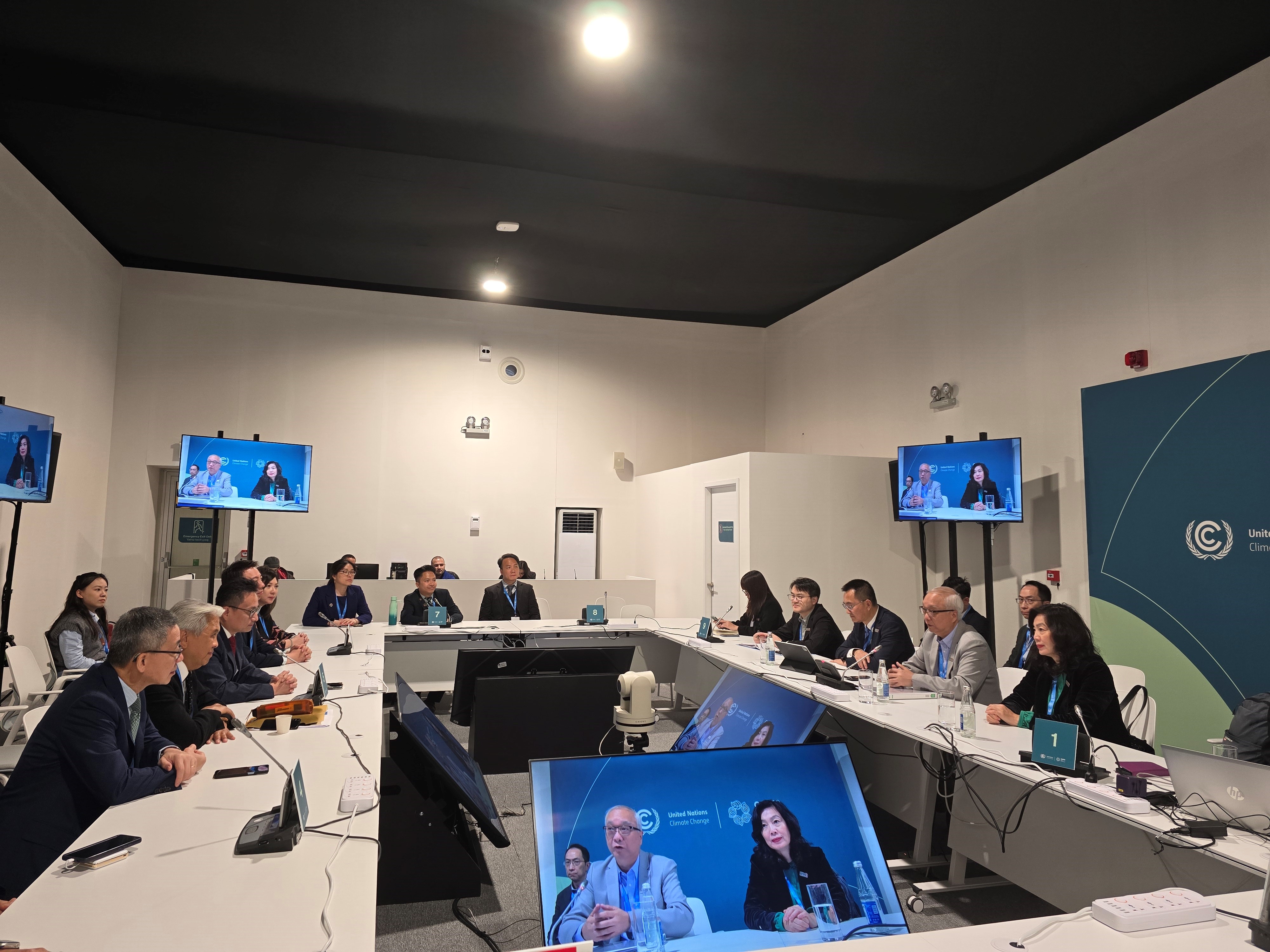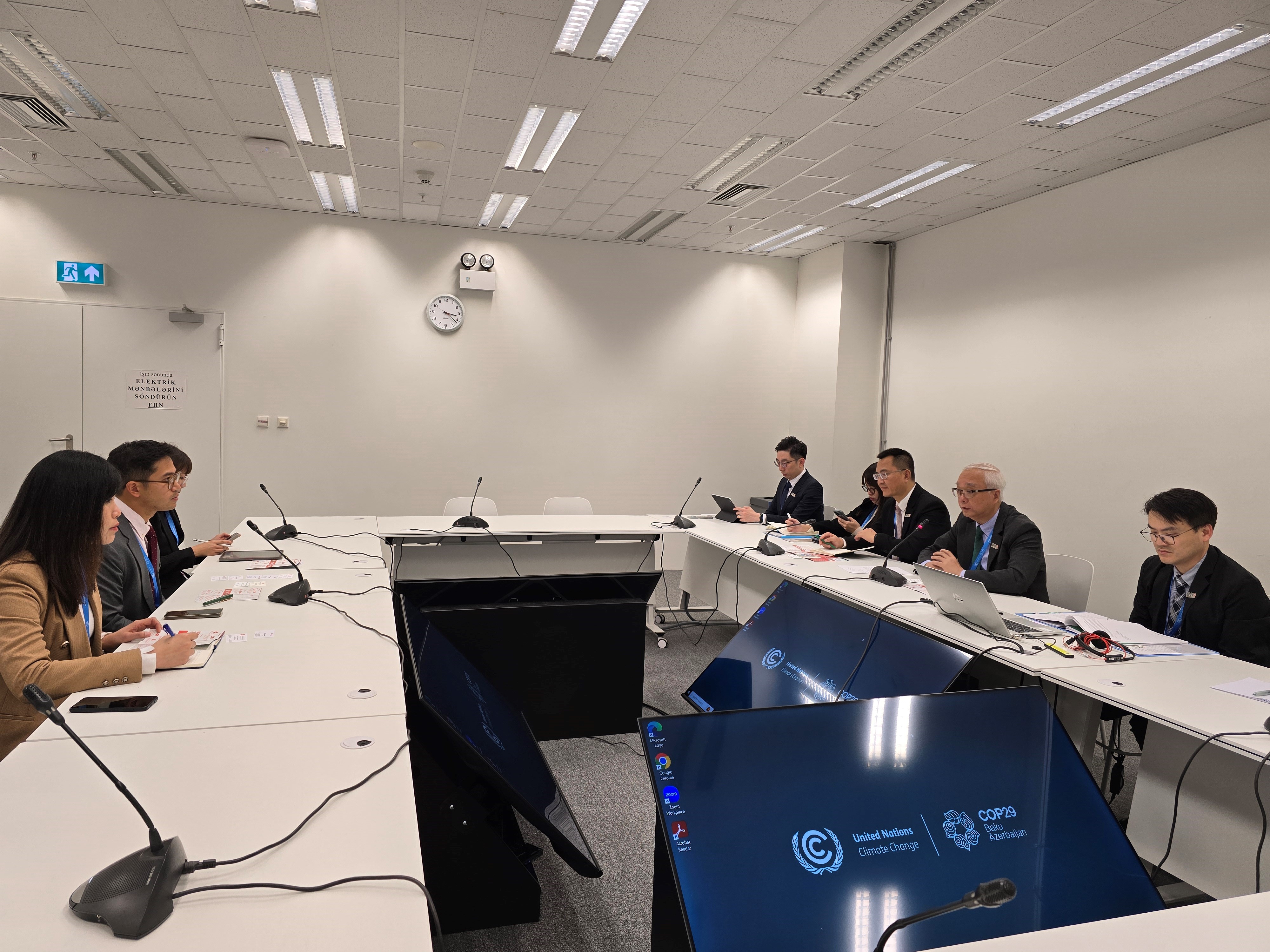 謝展寰十一月十一日(阿塞拜疆時間)抵達阿塞拜疆後,聯同財經事務及庫務局常任秘書長(財經事務)甄美薇與香港金融發展局及香港地球之友會面,了解兩個組織同日於氣候變化大會會場內中國角聯合舉辦的邊會活動之成果,並討論綠色金融、經濟綠色轉型、國際碳市場等議題。