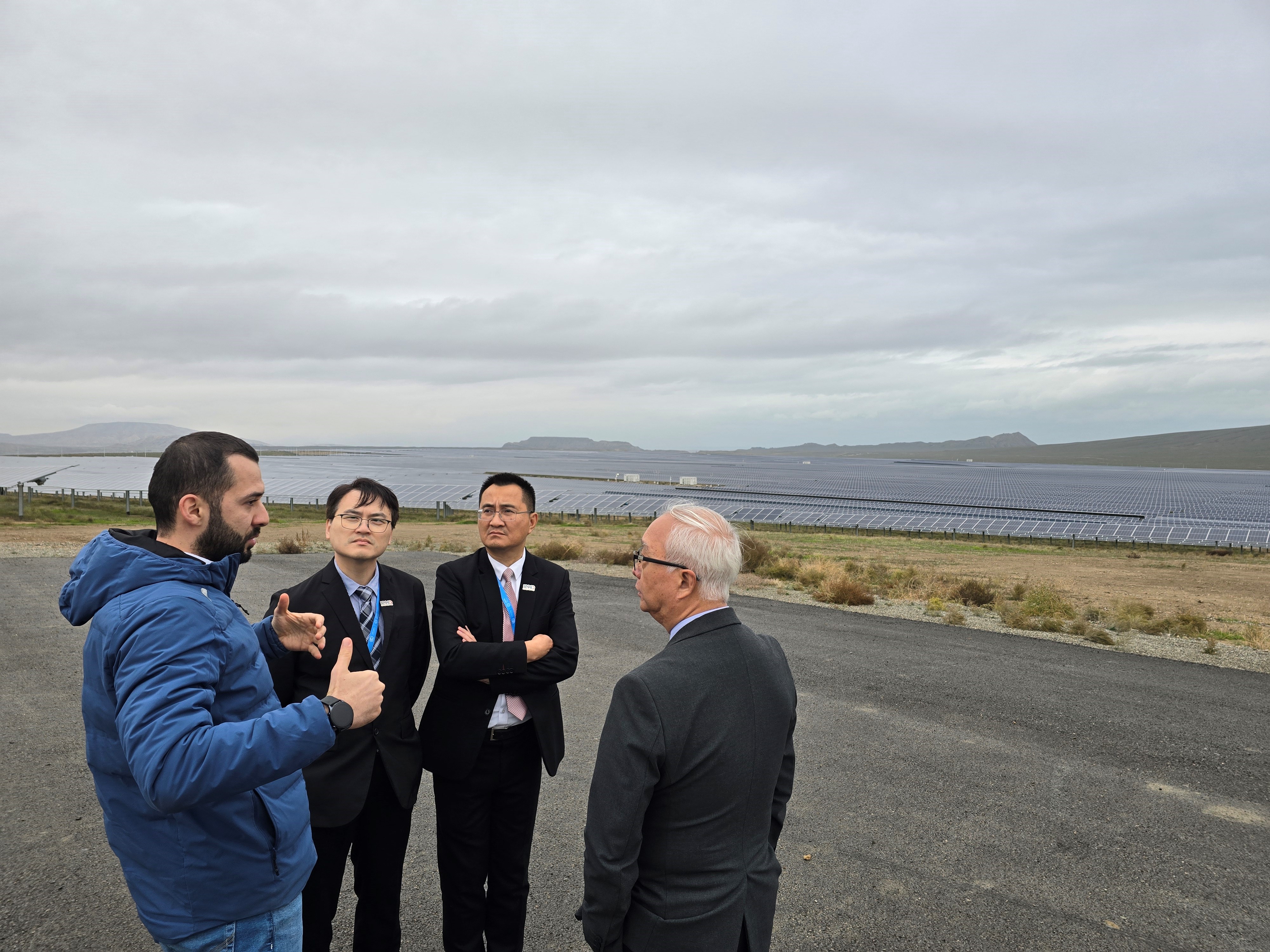 環境及生態局局長謝展寰(右一)、氣候變化專員黃傳輝(右二)和機電工程署助理署長李學賢(左二)昨日(阿塞拜疆時間十一月十二日)參觀了阿塞拜疆的Garadagh (Area 60) Solar Photovoltaic Power Plant太陽能發電廠設施,了解當地能源轉型的策略與進展,以及可再生能源的最新發展及相關經驗。