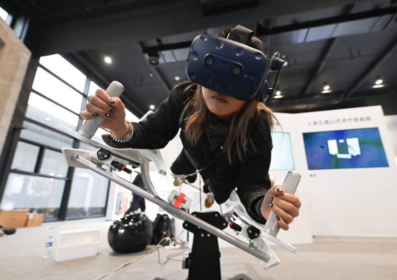 11月21日,在2024年世界互聯網大會“互聯網之光”博覽會上,參觀者體驗融合AIGC的飛行體感AI藝術療愈系統。 王剛 攝