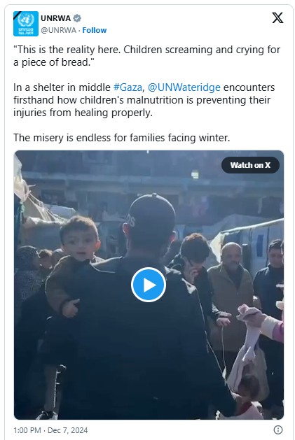 流離失所的巴勒斯坦人居住的許多避難所的情況很糟糕,受傷的兒童不斷哭泣,聯合國巴勒斯坦難民救濟和工程處的露易絲·沃特裡奇表示,這些兒童無法獲得食物,也無法從傷病中痊愈。