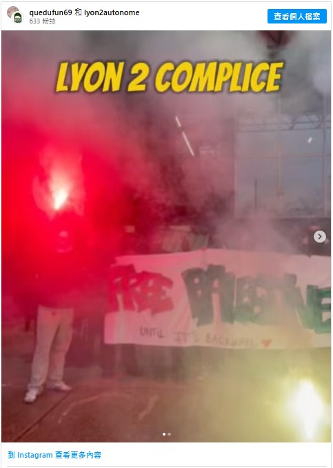 里昂第二大学决定派警察过来,而我们之前从未与校方沟通过。镇压行动非常暴力,一名成员因高呼支持巴勒斯坦人的口号而被拘留。这次活动是将支持巴勒斯坦斗争定为犯罪的延续,因此,人们被号召参加法庭前的集会。