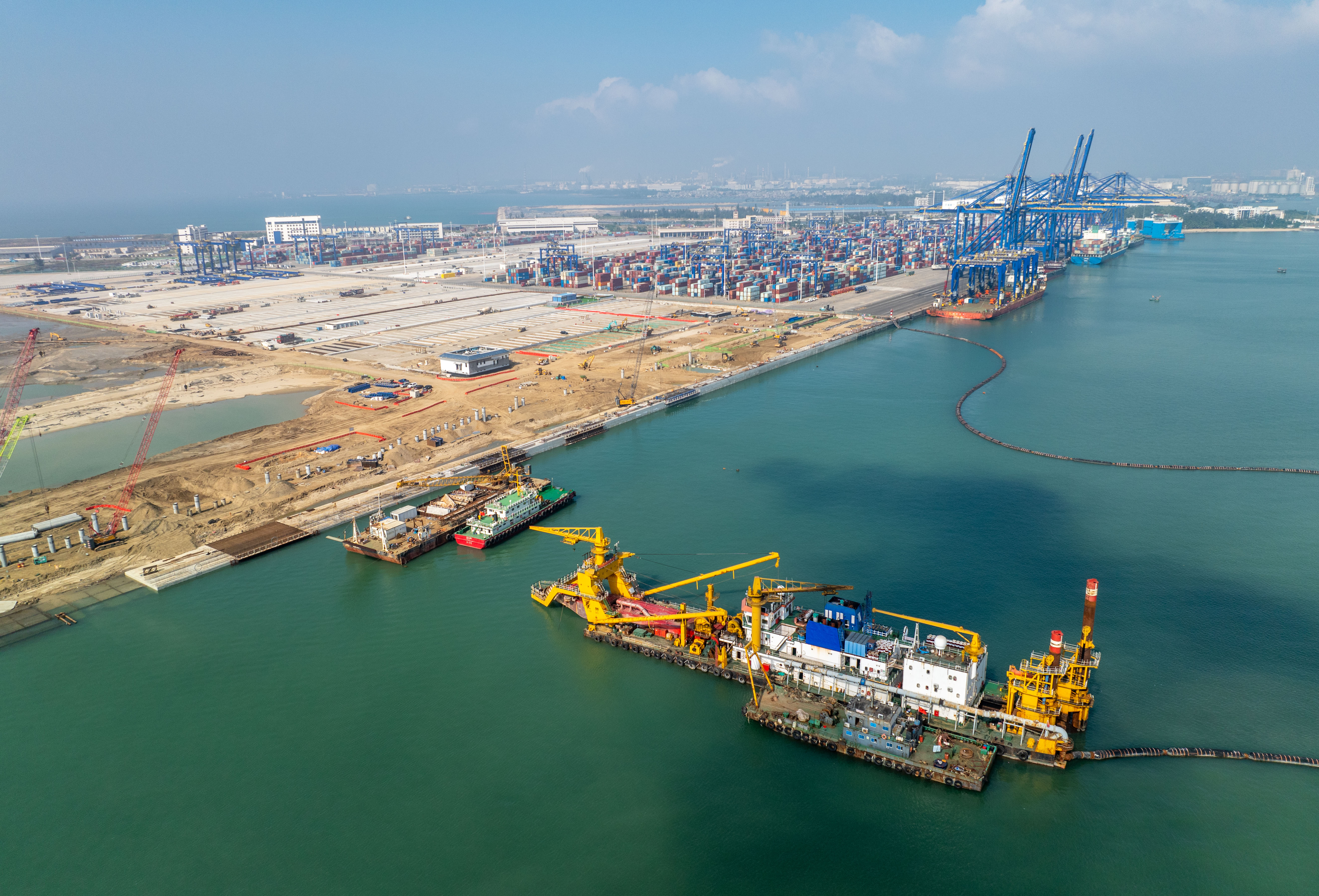 中新社海南儋州12月9日電 (記者 王子謙)時值年末,海南洋浦港國際集裝箱碼頭上,內外貿貨輪靠岸裝卸繁忙,車輛往來穿梭。而一側的洋浦區域國際集裝箱樞紐港擴建工程施工現場,吊機、挖掘機、打樁機等大型機械轟鳴。