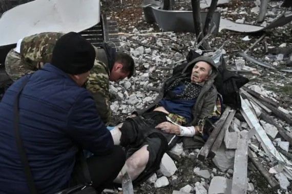 烏克蘭扎波羅熱州,一名警官將一名婦女從遭俄羅斯導彈襲擊嚴重損毀的建築物中疏散出來(路透)