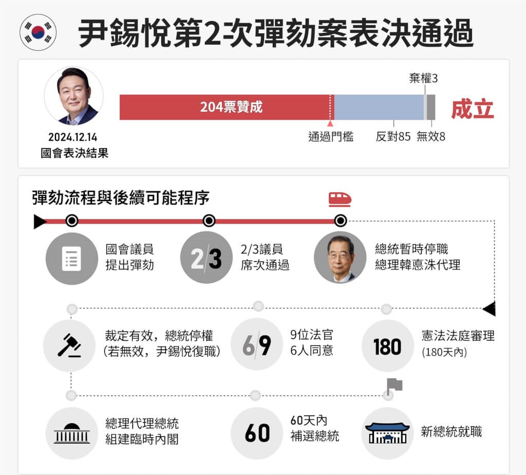 韓國國會14日(今天下午)4時(香港時間下午3時)第2次表決總統尹錫悅彈劾案,300票中以204票贊成通過。