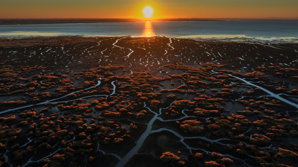 作品簡介:拍攝於2024年11月18日,遼寧盤錦遼河口濕地,初冬的早晨一輪紅日噴薄而出,灑向紅灘濕地,一道道潮汐溝宛如五線譜,奏響了濕地晨曲。