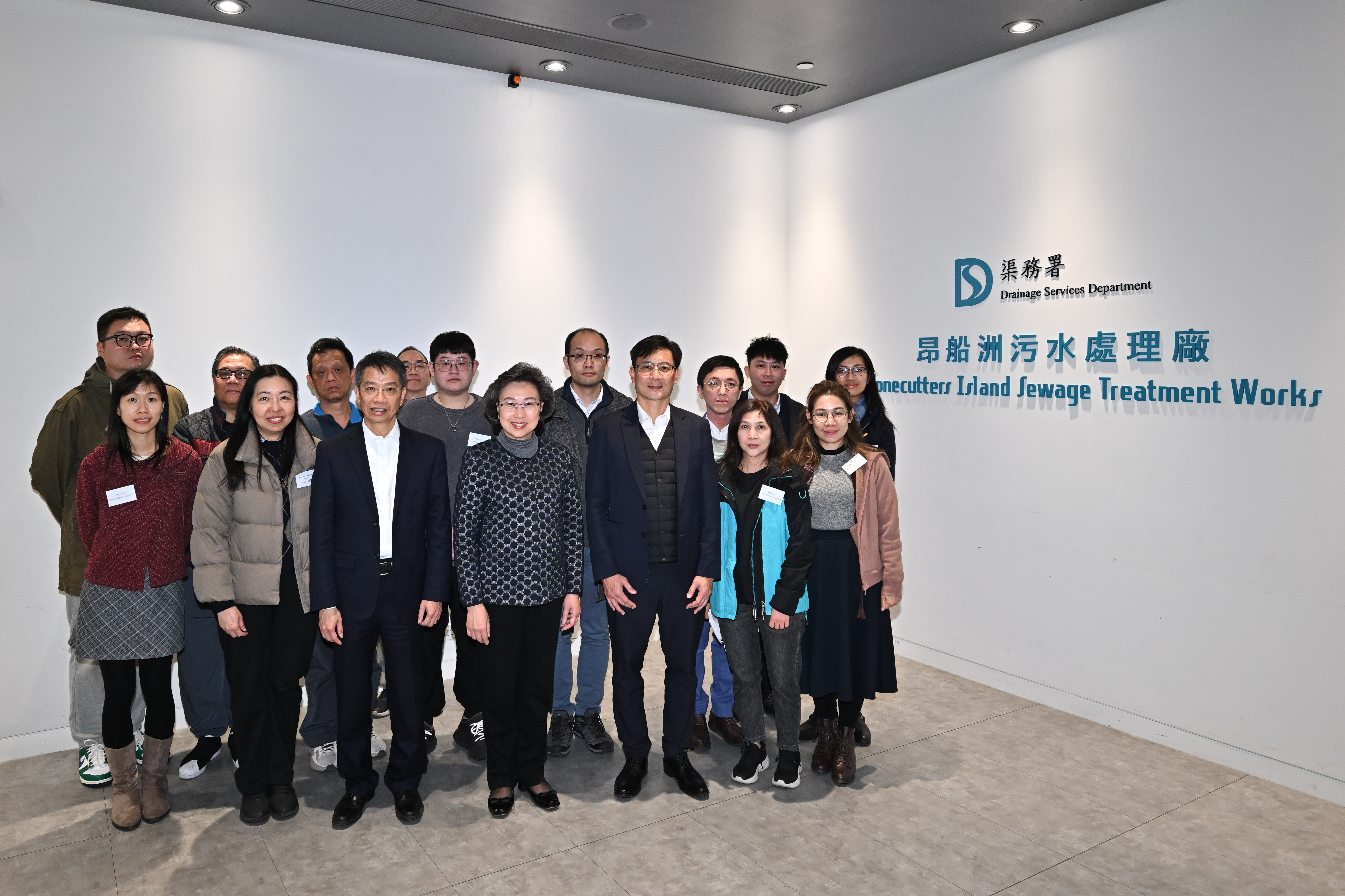他們隨後從綠化天台俯瞰昂船洲污水處理廠,其間聽取署方人員介紹污水處理設施,以及從該污水處理廠運送污泥往屯門轉廢為能的「淨港二號」等設施的運作。他們亦備悉署方推動昂船洲污水處理廠應用可再生能源的進度,包括預計明年內整體完成安裝柔韌薄膜太陽能光伏系統,屆時該系統將成為本港規模最大的同類型裝置。