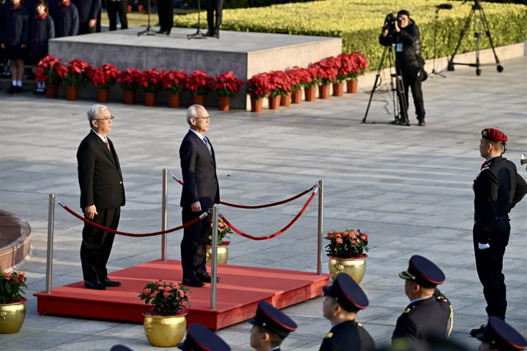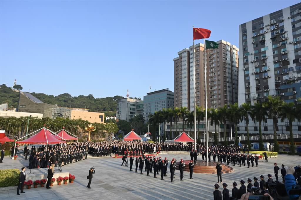 澳門特首岑浩輝(左2)20日出席澳門回歸25週年慶祝儀式升旗典禮。(中新社)