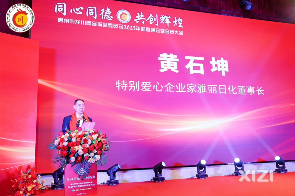 在晚會上,愛心企業家、雅麗日化董事長黃石坤先生,以及惠州市龍川商會執行會長鄭安華先生分別登臺致辭,向晚會致以熱烈祝賀。