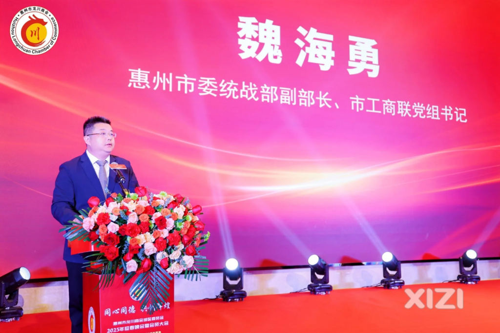 惠州市委統戰部副部長、工商聯黨組書記魏海勇先生登臺致辭。他代表市工商聯黨組織,對商會的付出給予了高度評價,並希望商會再接再厲,勇創佳績,未來能為鄉賢及地方經濟發展、社會公益等事業作出更多卓越貢獻。