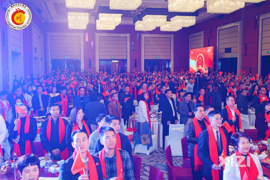 活動伊始,商會會員與嘉賓們滿懷喜悅,紛紛在簽到區留下自己的名字,並在精美的背景板前合影留念,定格這一美好瞬間。隨著主持人熱情激昂的開場白響起,全場氣氛瞬間被點燃。緊接著,全體人員整齊起立,莊嚴奏響中華人民共和國國歌,洪亮的歌聲飽含著每一位與會者對祖國的深深敬意與熱愛,也為這場商業盛宴注入了厚重的家國情懷底色。大螢幕上,惠州市龍川商會城區委員會發展歷程宣傳片以及商會領導班子介紹的視頻依次播放,那些記錄著拼搏與成長的畫面、閃耀著智慧與汗水的片段,將商會一路走來的艱辛與榮耀展現得淋漓盡致,讓在場眾人不禁沉浸其中,回首過往、展望未來。