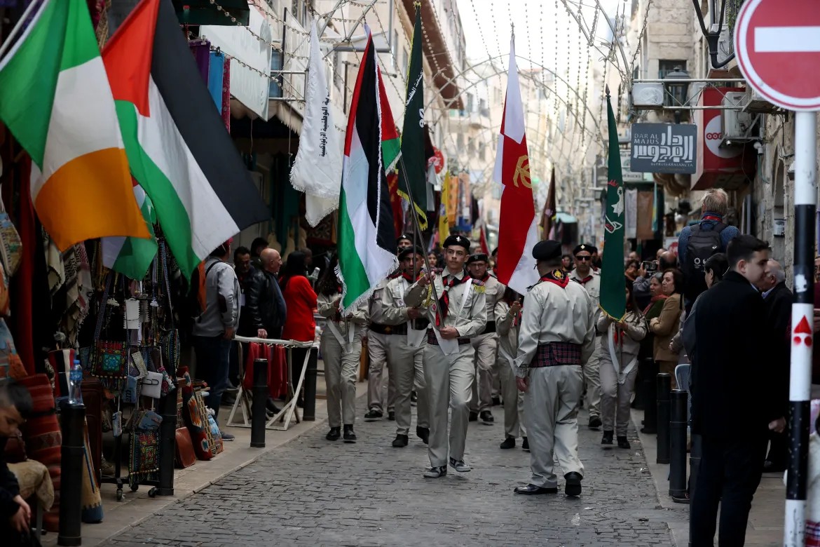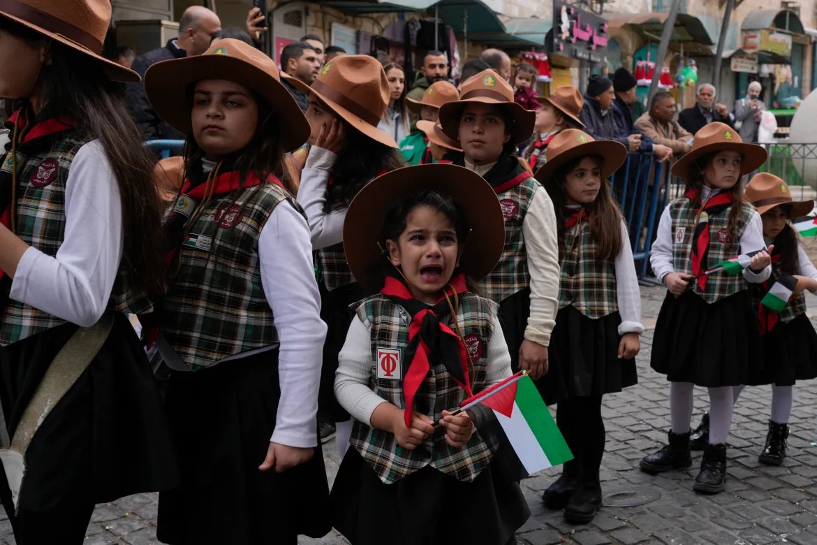 在伯利恆市中心,Terra Sancta 童子軍戴著紅圍巾,沿著主要的購物街游行,那裡的小販們正在賣牛軋糖和沙瓦瑪。
