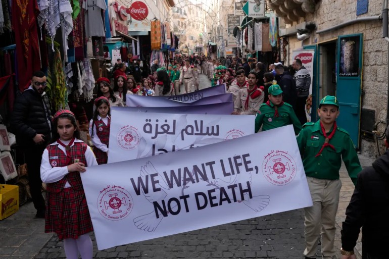 孩子們唱聖誕頌歌的甜美聲音響徹雲霄,與他們手舉的橫幅上寫著的嚴肅信息形成鮮明對比:“我們要生命,不要死亡”和“立即停止加沙種族滅絕!”