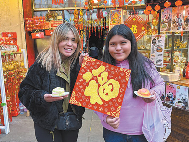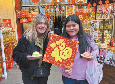 临近蛇年春节,位于墨西哥首都墨西哥城的唐人街节日氛围浓厚。图为两名女孩在中国产品超市展示福字。