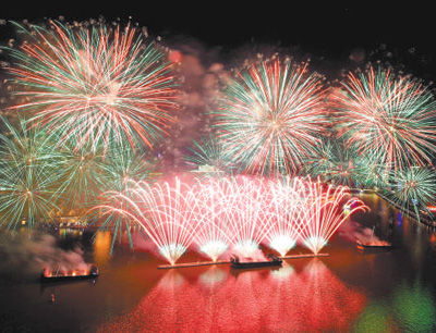 广东广州市白鹅潭春节烟花汇演在珠江畔上演。吴庭峰摄(人民视觉)
