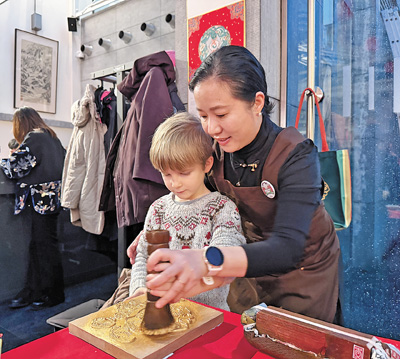 比利时布鲁塞尔中国文化中心日前举办“欢乐春节·水韵江苏”民俗文化展。图为桃花坞木版年画代表性传承人乔兰蓉指导小朋友拓印“福”字。本报记者 牛瑞飞摄