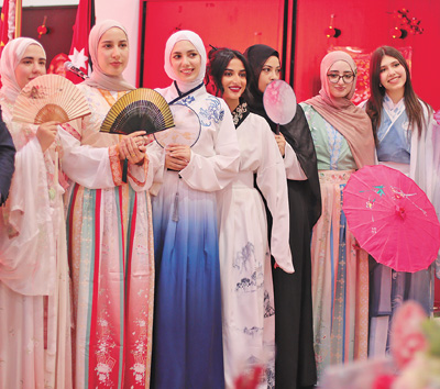 约旦安曼中国文化中心和费城大学孔子学院日前联合主办“2025欢乐春节进校园”活动。图为当地学生展示汉服。石莹丽摄
