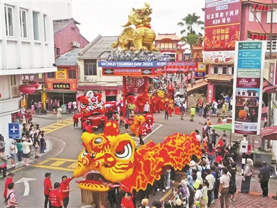 在马来西亚马六甲鸡场街,100人共同舞动一对“马中友谊瑞狮”迎接新春。鸡场街文化坊工委会主席颜天禄说,“马中友谊瑞狮”为呼应马中两国同意联合申请将“舞狮”项目列入联合国教科文组织人类非物质文化遗产代表作名录而打造,“这是‘春节’申遗成功后的首个中国传统新年,各族同乐的氛围更加浓郁”。2000余盏红灯笼、6座贺岁牌楼、江苏省赠送的“秦淮花灯”、河南安阳市赠送的“十二生肖甲骨文立体灯饰”等,让这条不足千米的街道年味十足。