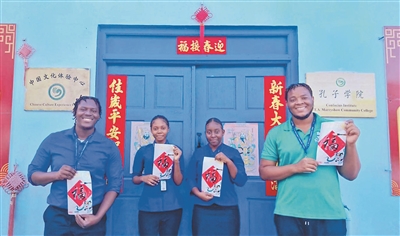 格林纳达玛丽秀社区大学孔子学院学生展示“福”字海报。格林纳达玛丽秀社区大学孔子学院供图