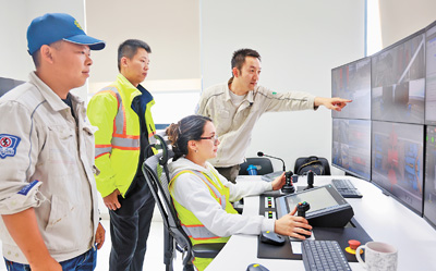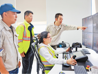 春节期间,秘鲁钱凯港的中秘员工仍坚守岗位。这是两国员工在远程操控设备。本报记者 宋亦然摄