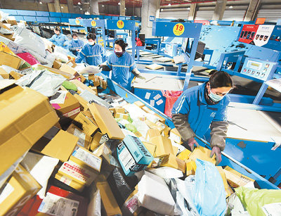 春节假期,江苏省连云港市东海县电商物流产业园工作人员全力保障物流快递畅通运转,实现分拣、派送快递业务节日期间“不打烊”。图为快递工作人员在该产业园内的流水线上分拣快递包裹。