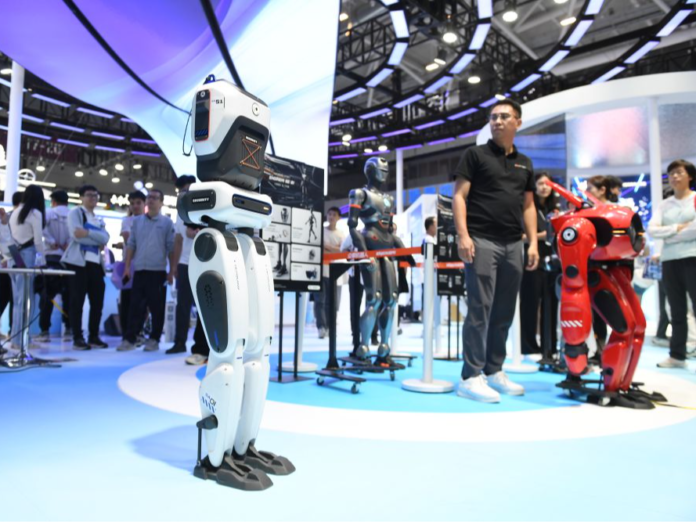 2024年11月14日,在第二十六届中国国际高新技术成果交易会上,深圳市众擎机器人科技有限公司展示机器人的行走能力。 新华社记者毛思倩摄