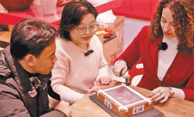 唐磊和小梅在前门大街附近一家艺术馆体验铜版画制作。