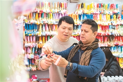 浙江金华义乌国际商贸城里,外国采购商在与商家洽谈,采购商品。胡肖飞 摄(人民视觉)