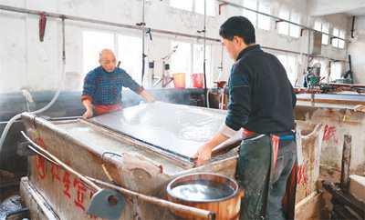 两位师傅正在生产车间纸浆池旁捞纸。一掌一抬,在配好的纸浆槽中一深二浅两次捞造后,宣纸即呈现在纸帘之上。王德强 摄