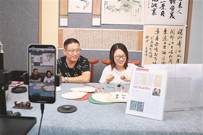 在李园村电商服务中心(一期)二楼直播间,主播正在直播带货,售卖该村的宣纸文房四宝产品。闫顺 摄