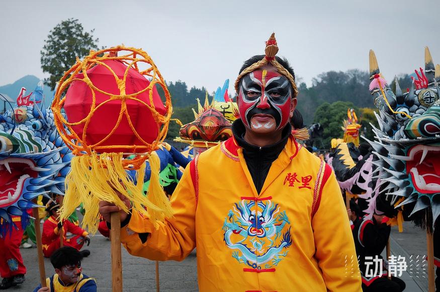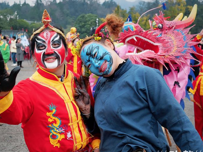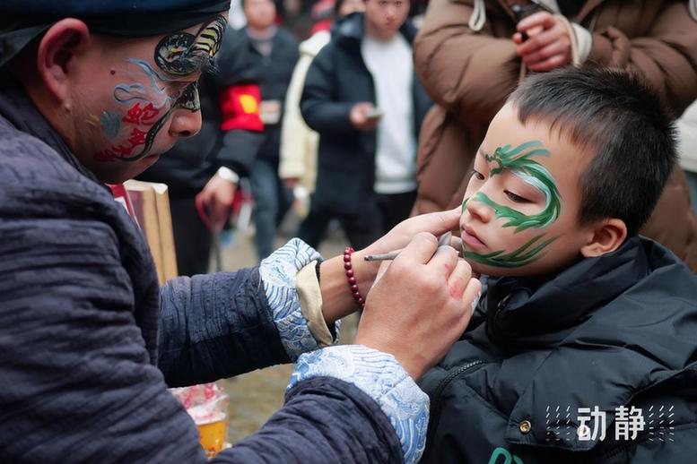 湖南游客金子微和家人从湖南驾车来到古城,体验了一把画花脸,她兴奋地告诉记者:“驾车过来就是想感受一下这边的年味儿,最期待的就是花脸龙表演。”