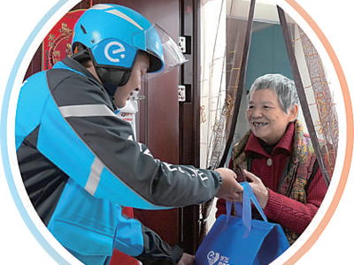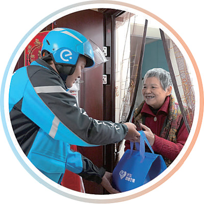 外卖骑手张魁在社区开展助老送餐服务。资料图片