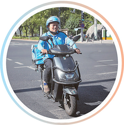 外卖骑手丁书会在送单途中。资料图片