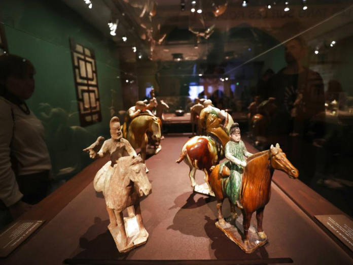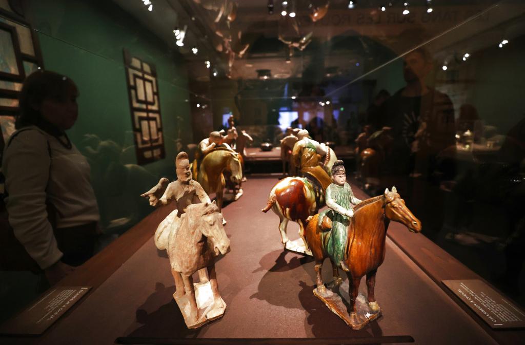2024年11月18日,在位于法国巴黎的吉美国立亚洲艺术博物馆,人们参观“中国·唐——一个多元开放的朝代(7至10世纪)”展览。新华社记者高静摄