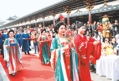湖北省襄阳市唐城景区举行汉服婚礼秀,吸引了众多游客观看。杨东摄(人民图片)