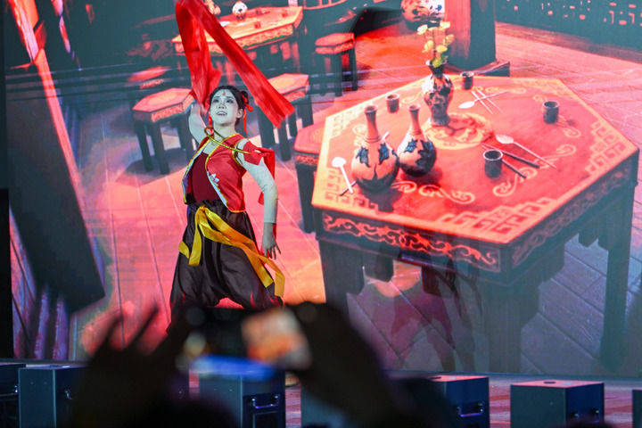 图为“鲤跃龙门”演艺餐饮主题餐厅的演艺表演现场。新华社发(姜艺莎摄)