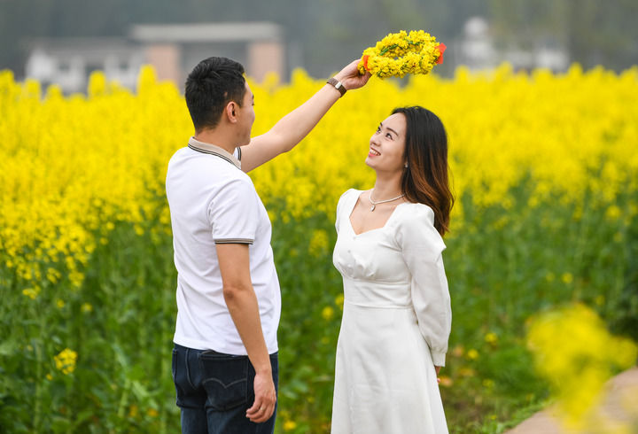 3月12日,游客在重庆潼南崇龛花海景区拍照。新华社记者 王全超 摄