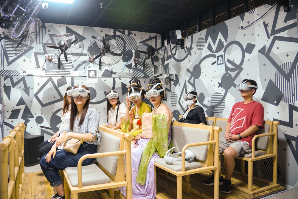 游客借助VR设备沉浸式体验《风起洛阳》虚拟场景。新华社发(姜艺莎摄)