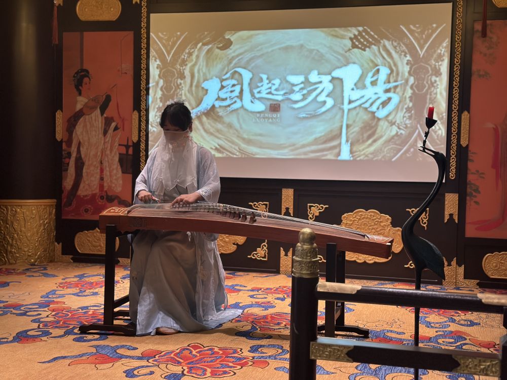《风起洛阳》VR全感剧场内,身着古装的演艺人员现场弹奏古筝。新华社发(姜艺莎摄)