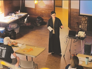在课堂上,范伊立结合之前的教学经历,研究出了“充满空间”训练法,帮助羞于登台、害怕展示自己的同学们更好地认识自己的身体与情感,带入角色。