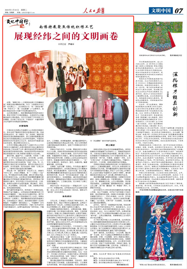 此次展览策展人、南京博物院副研究馆员张茹介绍,展览中荟萃了江南织绣精品,尤其是宋代以来巅峰创造的江南织绣品。它们不仅体现了中华传统工艺的精湛,还反映了自古以来“中国设计”丰富的精神文化内涵和与时俱进的创新精神。