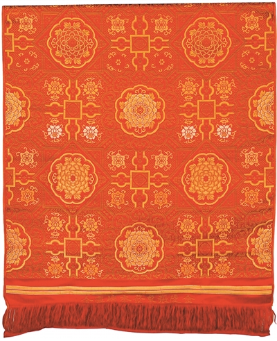 宋锦主产地为苏州,与云锦、蜀锦并称为中国古代三大名锦。宋锦采用经线纬线联合显花的组织结构和彩抛换色工艺,风格古朴典雅,在古代多用于书画装裱,有着独特的艺术魅力。清代红地如意牡丹纹天华锦为宫廷用宋式锦,红缎地上以彩色丝线和金线作纬显花,图案基本骨架为典型的宋锦纹样——“米”字状八达晕式样,饰有牡丹、莲花、如意纹等,寓意富贵安康、吉祥如意。
