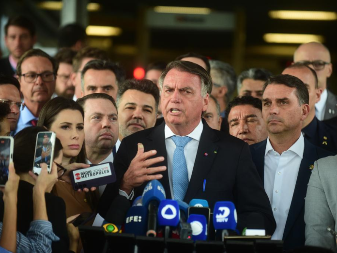 3月26日,在巴西首都巴西利亚,前总统博索纳罗在参议院向媒体讲话。新华社发(卢西奥·塔沃拉摄)