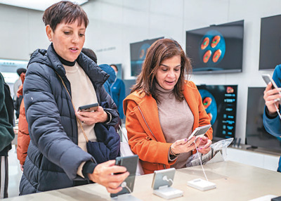 外国游客在上海华为旗舰店体验华为新款手机。王 初摄(人民图片)