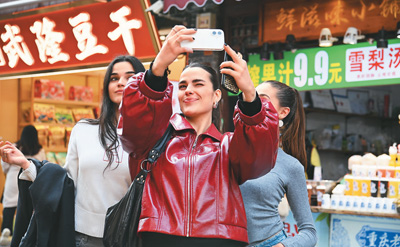 外国游客在重庆市磁器口古镇游览拍照。孙凯芳摄(人民图片)