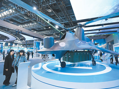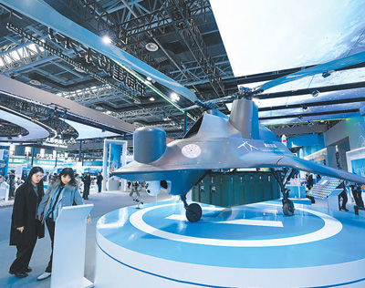 3月28日,在中关村展示中心常设展内,参观者在参观展出的一款重型交叉双旋翼无人直升机。新华社记者 鞠焕宗摄