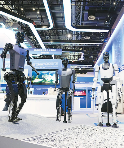 在这里,记者见到北京人形机器人创新中心展出的“天工2.0”机器人。这个一人多高、黑白相间的机器人,能稳稳地爬上楼梯,走路时遇坑洼路面还能调整步态。该展台工作人员介绍,“天工”机器人是能实现复杂地形自适应行走的仿人机器人,即它在平地行走时,保持直膝行走的拟人姿态;在面对台阶、斜坡、楼梯、坑洼路面等地形时,可实时调整为稳定步态,具备面对复杂地形等具备高通过性。目前,“天工”机器人已在电力巡检场景下,完成了放电操作和倒闸操作的实训,预计未来将应用于工业巡检、家庭服务等领域。
