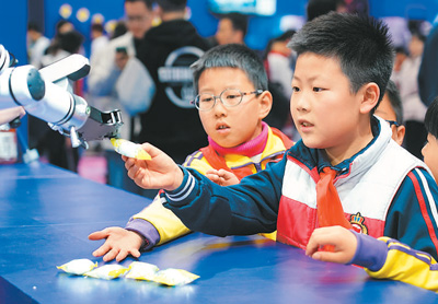 石景山全国中小学科学教育实验区展区门口,一台3D打印的擎天柱雕塑机器人格外吸睛。北京大学附属中学石景山学校高一学生陈沐霖说,这台机器人是他和同学们在“3D创新设计与电子控制”选修课上一起创作的。“我是一名科幻迷,读过不少知名的中外科幻小说。现在技术发展日新月异,让我感觉非常震撼,我希望自己在未来也能做出前沿的科技成果。”