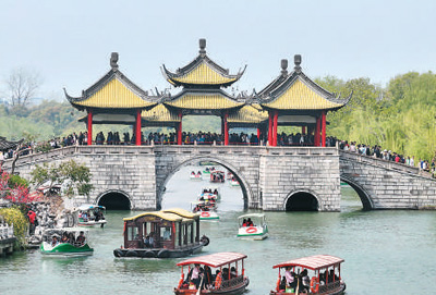 游客在江苏省扬州市瘦西湖风景区内乘船游览。孟德龙摄(人民视觉)
