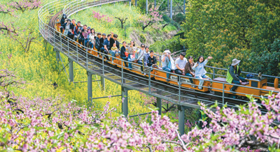 浙江省湖州市长兴县和平镇城山沟景区,游客乘坐观光小火车徜徉花海。谭云俸摄(人民视觉)